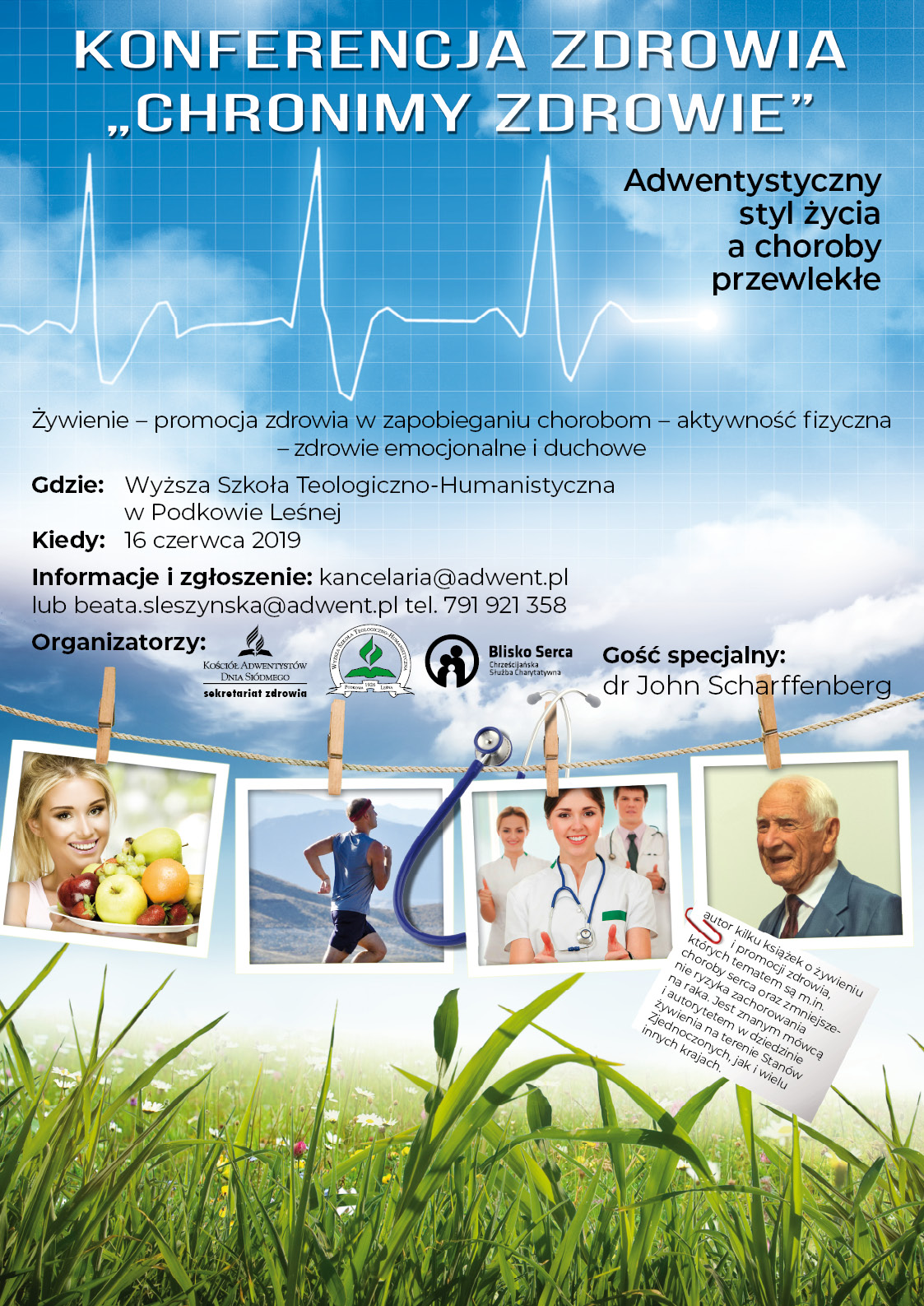 Pragnę zaprosić Was do udziału w konferencji zdrowia , która odbędzie się 16 czerwca 2019, w progach Wyższej Szkoły Teologiczno – Humanistycznej w Podkowie Leśnej. Rozmawiać będziemy o adwentystycznym stylu życia w odniesieniu do chorób przewlekłych. Będzie to też dobry czas na wymianę doświadczeń w służbie drugiemu człowiekowi. Gościem specjalnym konferencji będzie dr John Scharffenberg z USA, który gościł wcześniej w Polsce. Jest znanym mówcą i autorytetem w dziedzinie żywienia i zdrowia publicznego. To niezwykła postać, oddana misji zdrowia a swoją postawą zachęca do dbałości o zdrowie i zaangażowanie do służby.