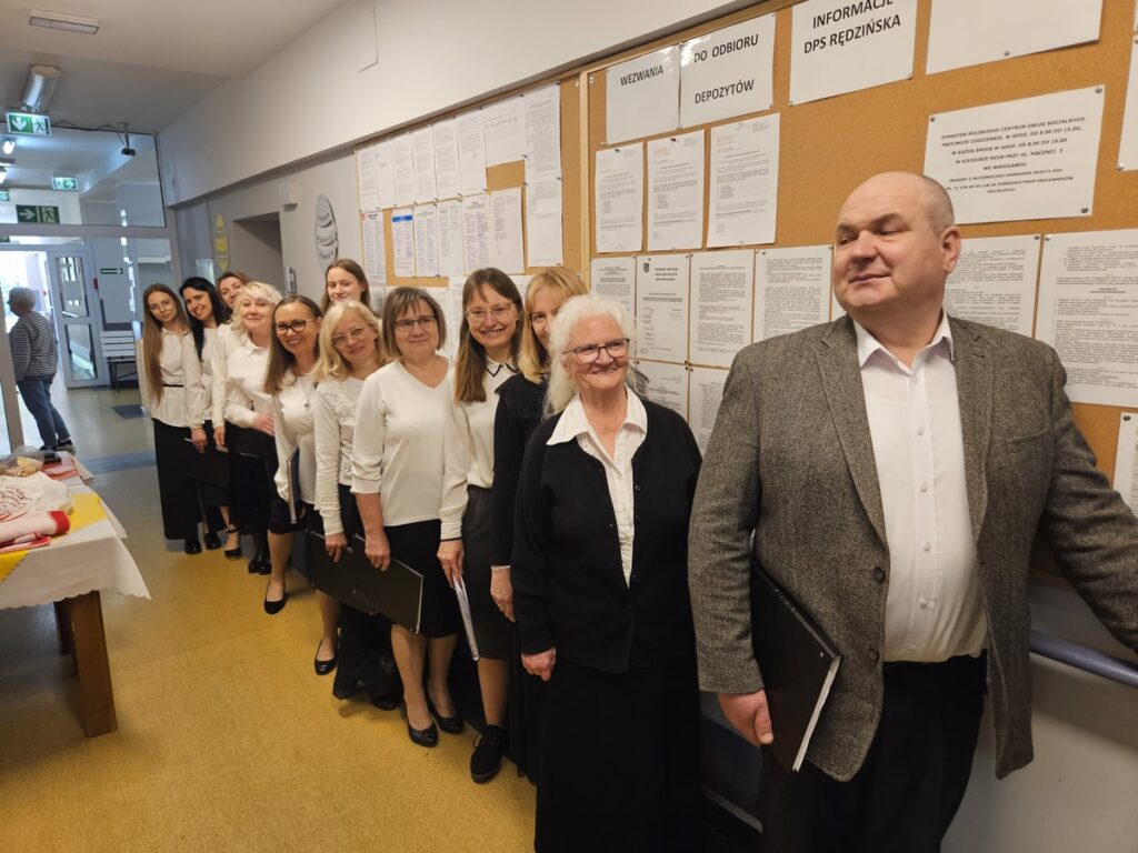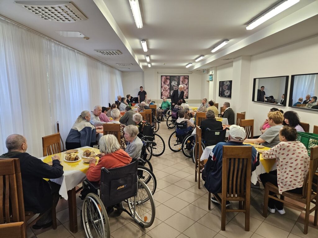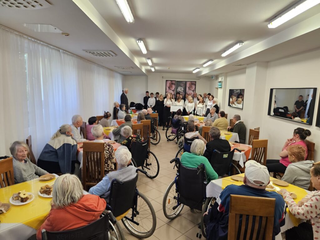 Członkowie chóru przygotowali również słodki poczęstunek w postaci domowego ciasta, którym poczęstowano mieszkańców i personel ośrodka. Spotkanie zakończyło się rozmowami i wspólnym czasem, sprzyjającym budowaniu serdecznych relacji.