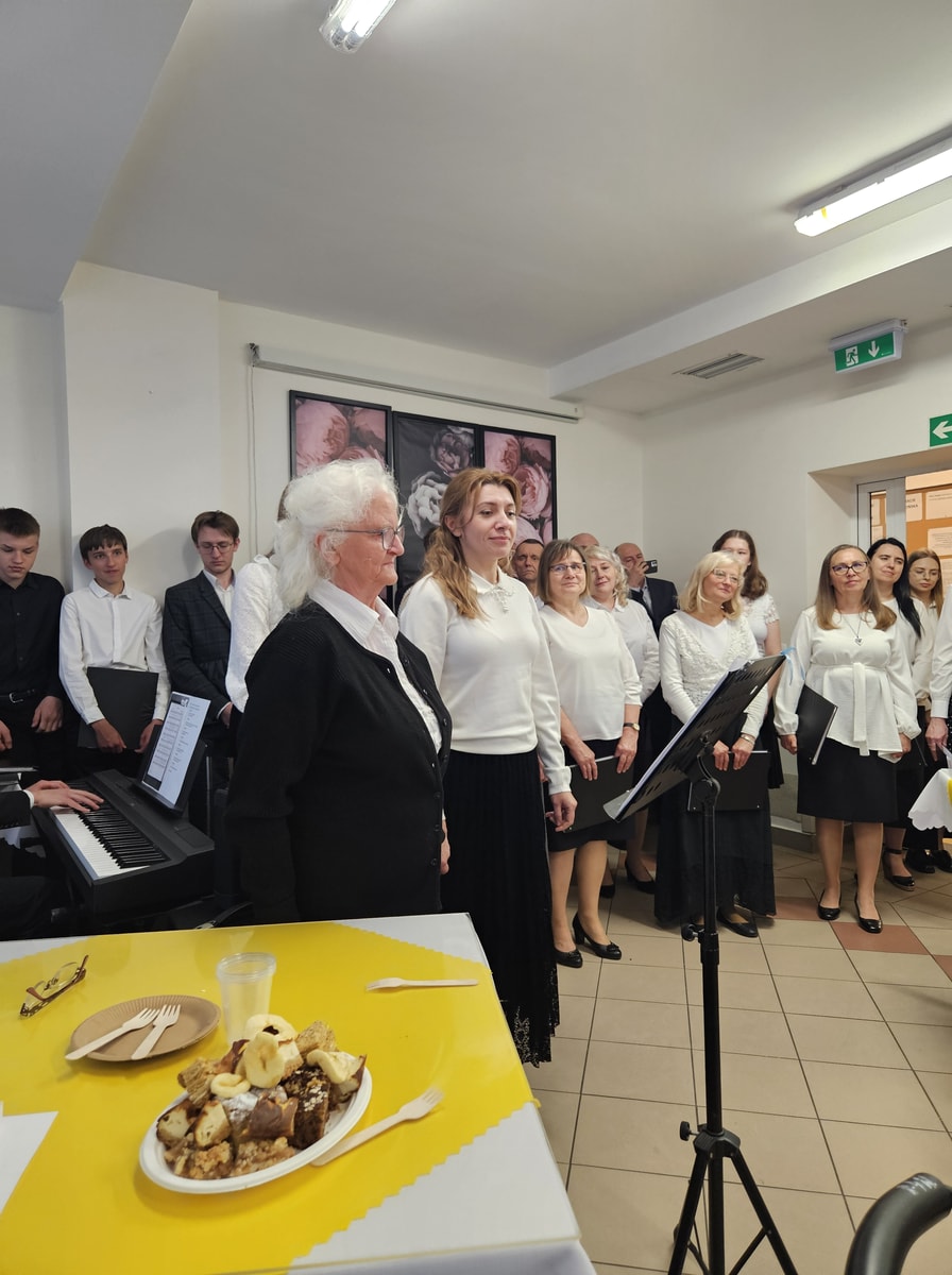Członkowie chóru przygotowali również słodki poczęstunek w postaci domowego ciasta, którym poczęstowano mieszkańców i personel ośrodka. Spotkanie zakończyło się rozmowami i wspólnym czasem, sprzyjającym budowaniu serdecznych relacji.