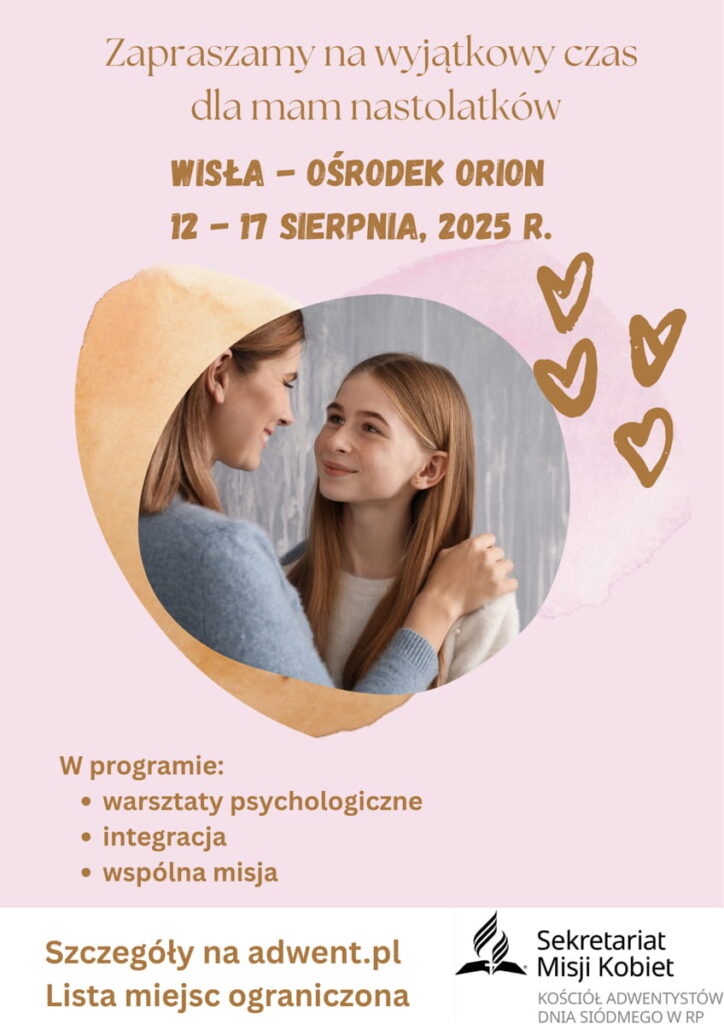 Jeżeli jesteście mamami nastolatków to serdecznie zapraszam na wyjątkowe letnie warsztaty pełne inspiracji, motywacji i wsparcia. Program odbędzie się w Ośrodku Orion w Wiśle, w dniach od 12 do 17 sierpnia 2025 roku. Czego możecie się spodziewać? Nasze spotkanie ma dwa zasadnicze cele. Po pierwsze, naładować duchowe, psychiczne i fizyczne akumulatory a po drugie, wziąć udział w ciekawych warsztatach, które pomogą zrozumieć naszą rolę jako mamy nastoletniego dziecka, poprawić komunikację z nim oraz zrozumieć jego potrzeby. W warsztatach poruszymy między innymi takie tematy: jak umiejętnie wyznaczać granice, wspierać emocjonalny rozwój dziecka oraz jak z Bożą pomocą pomóc naszemu dziecku rozwijać umiejętność podejmowania dobrych decyzji. Nie zabraknie też wspólnego wypadu na Baranią Górę, wspólnych poranków przy Słowie Bożym i modlitwie.
