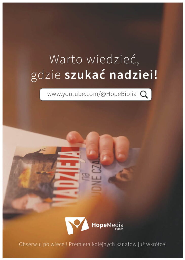 Od początku stycznia swoją działalność rozpoczął kanał YouTube Hope Biblia. Publikowane jest tam studium biblijne oparte na kwartalniku Lekcji Szkoły Sobotniej. Pod koniec lutego planowana jest długo oczekiwana premiera serii dokumentalnej „Wielki Bój”. Serdeczne podziękowania za jej przygotowanie kierujemy do Diecezji Południowej Kościoła Adwentystów w Polsce oraz Fundacji Źródła Życia. Kanał Hope Biblia będzie rozwijany także o kolejne materiały, dlatego zachęcamy do subskrypcji, aby pozostać na bieżąco.